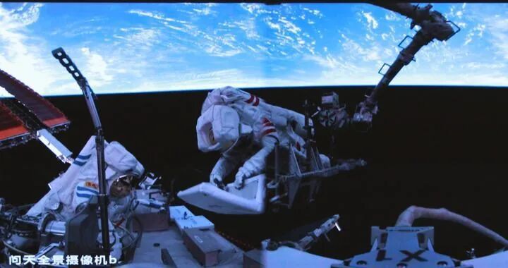 這是2025年6月26日在北京航天飛行控制中心屏幕上拍攝的神舟二十號航天員陳冬(左)與陳中瑞在空間站組合體艙外工作的畫(huà)面。新華社發(fā)(周柯毅 攝)