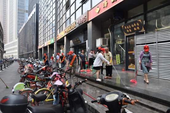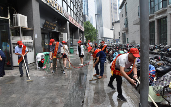 二、“全城清潔”行動(dòng)。清潔家園,黨員志愿者義不容辭。日前,市建投聯(lián)合商務(wù)社區積極響應“全城清潔”行動(dòng)號召,定期組織志愿者對社區單位公共區域、沿街商戶(hù)門(mén)店等內外環(huán)境進(jìn)行集中整治。7月14日下午,市建投黨員志愿者分赴中國人保大廈對沿街商戶(hù)門(mén)店和街道進(jìn)行集中清理。大清掃活動(dòng)采取包干打掃、分頭行動(dòng)的方式,集中對沿街商鋪門(mén)店垃圾桶(池)、地面污漬等進(jìn)行清洗,全面清理整治各類(lèi)衛生死角,清理積存垃圾,杜絕垃圾亂堆亂放。烈日炎炎,市建投黨員志愿者們絲毫不懼37度的高溫,頭戴小紅帽,戴著(zhù)紅袖標,以高度的敬業(yè)態(tài)度和為人民服務(wù)的無(wú)比熱情,全身心投入到環(huán)境衛生清理中,通過(guò)2個(gè)小時(shí)的辛苦勞動(dòng),使人保大廈沿街門(mén)店商鋪和街道面貌煥然一新。